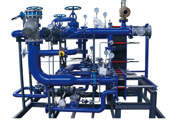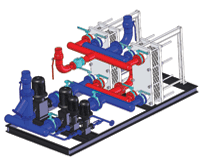 板式换热机组是把一次网得到的热量,自动连续的转换为用户需要的生活用水及采暖用水。即热水(或蒸汽)从机组的一次侧入口进入板式换热器进行热交换后,从机组一次侧出口流出;二次侧回水经过过滤器除去污垢后,通过二次侧循环水泵进入板式换热器进行热交换,生产出用于采暖、空调或地板采暖等不同温度的热水,以满足用户的需求。